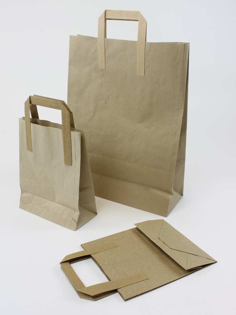 Flat handled, brown Kraft paper carriers bags are simplistic, practical and highly versatile in application.