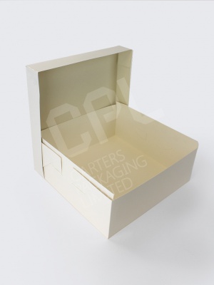 Large white cake boxes designed with no staples which can be used as open trays or combined with the lids to form strong boxes.