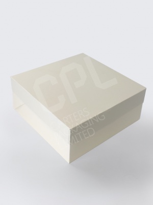 White and sturdy cardboard boxes that consist of an open box with a separate removable lid. The lid is slightly larger than the base and neatly fits over the top forming a secure environment.