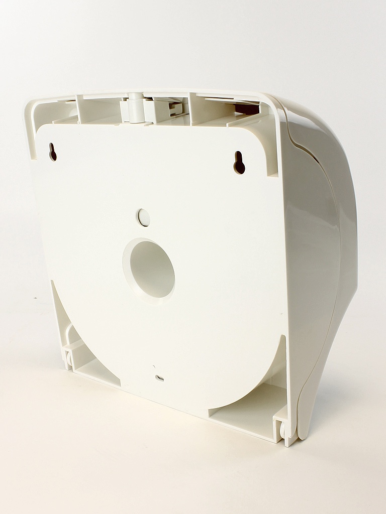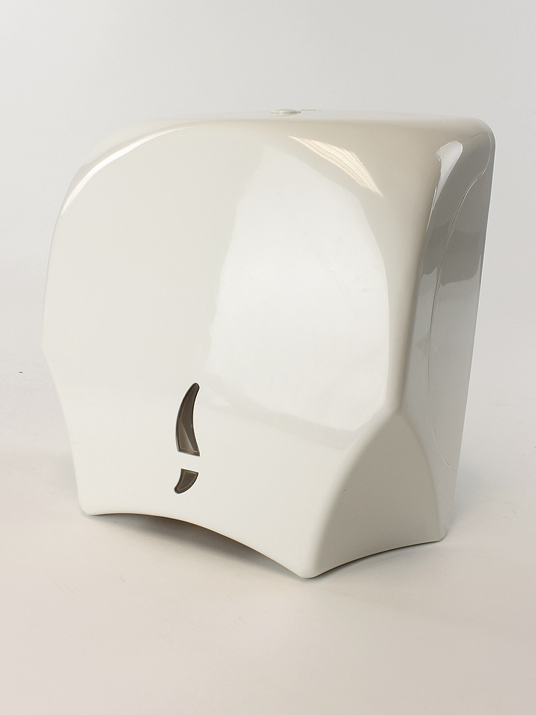 White, highly polished and minimalistic style mini centre feed dispenser which can be mounted onto walls for practical reasons. An easy and practical object for keeping your rolls of centre feed clean and dry whilst simultaneously minimalizing waste and maximising storage space (especially handy for those smaller facilities). Because these wall mountable dispensers are made from sturdy plastic, they are easy to keep clean and re-fill when required.