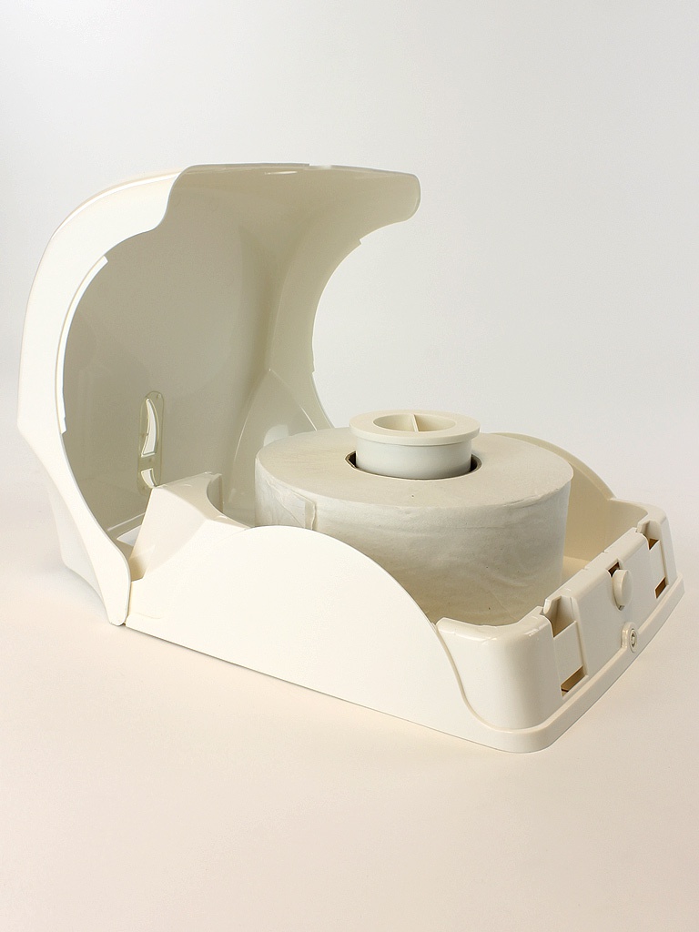 Functional dispenser for rolls of centre feed which can be fixed to a wall or other surface for easy access in public toilet facilities and washrooms.