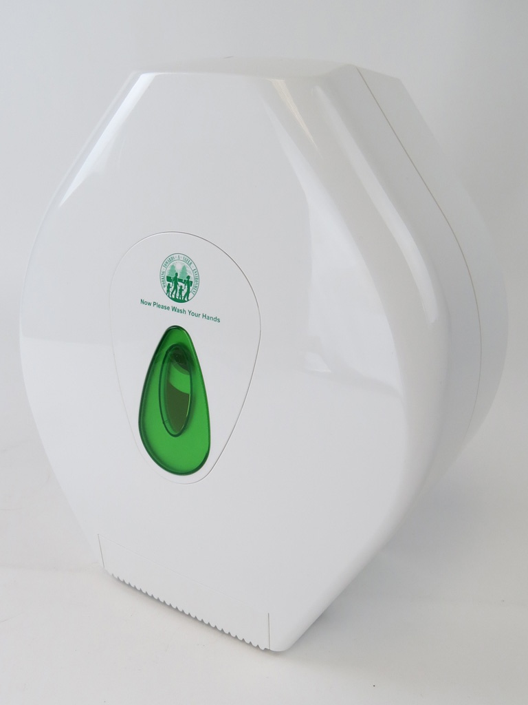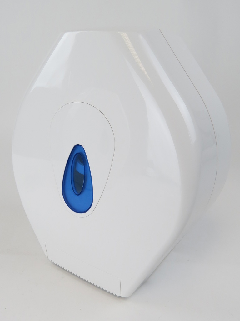 White plastic mini jumbo toilet roll dispenser that is a compact and practical approach to storing and displaying toilet roll for easy access and distribution. Simply attach to a cubicle frame or mount on a wall using the 4 screws and raw plugs provided. These systems are easy to refill when required plus they boast a bright clean design to help promote health and hygiene. The tear drop shaped window allows user to see when toilet rolls are approaching their end. The bottom section is adorned with sharp teeth enabling the tissue paper to be torn easily and quickly.