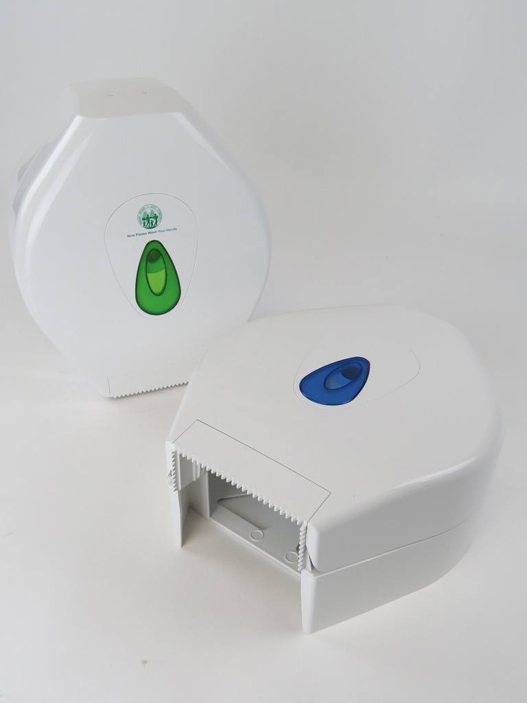 White modular mini jumbo dispensers made from durable plastic. Wall mountable and designed for toilet rolls.