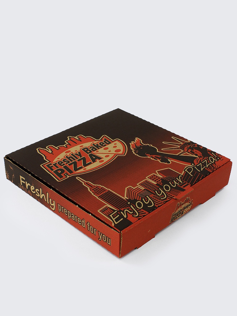 Printed pizza boxes with the traditional folding lid. Make more of an impact with your packaging by choosing a generic printed design.