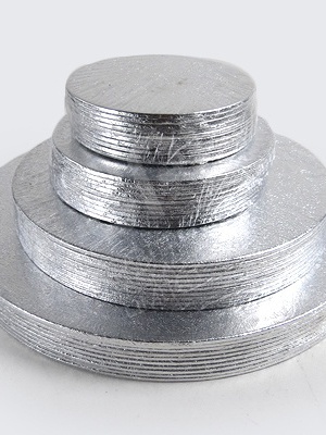 These double-thick (3mm) rigid cake boards are coated in silver foil. Use these quality round cake boards to professionally present your creations. Choose from our substantial range of round cake boards which will provide the perfect base for sponges, fruit cakes and wedding cakes. They can also be used for tiered structures for all stacking cakes.