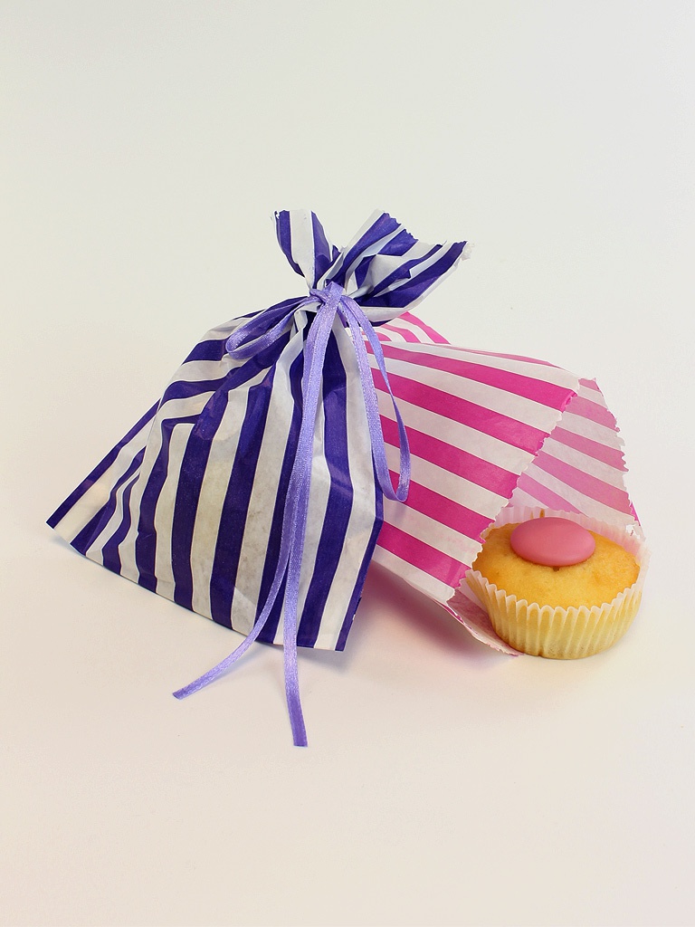 Traditional "Olde Sweet Shoppe" style paper bags with the familiar striped pattern, available with pink or blue stripes.