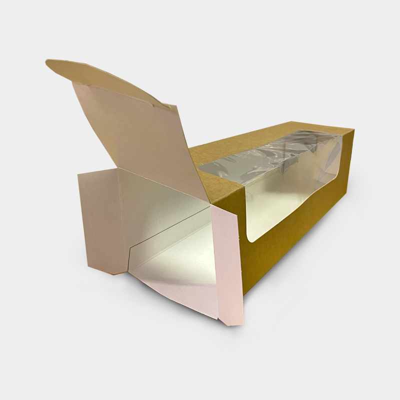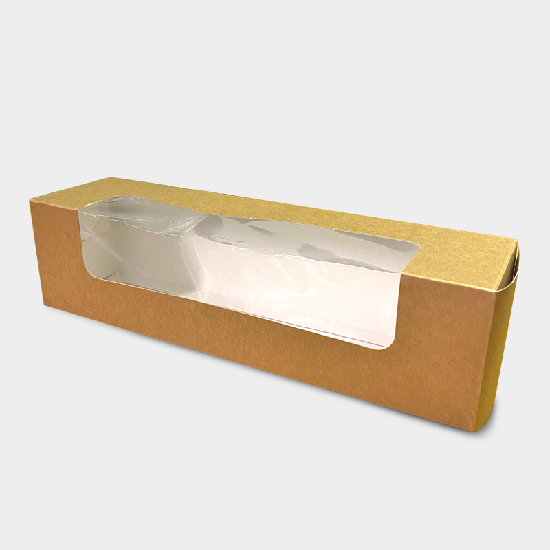 Kraft cardboard baguette trays with a clear film presentation window and simple side-tuck closure. The closure is not air-tight so these are a "same day" consumption product line. One appealing feature about ‘same day’ packaging, is that it reassures customers the products are fresh.